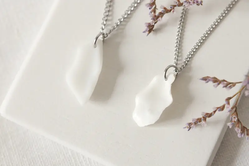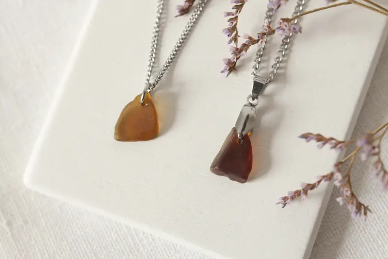 Drobceni koščki stekla, ki jih je morje izoblikovalo skozi leta, so zdaj postali čudovit osrednji del moje nove kolekcije ogrlic.
