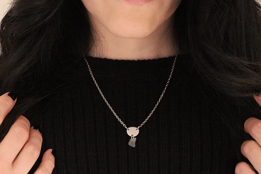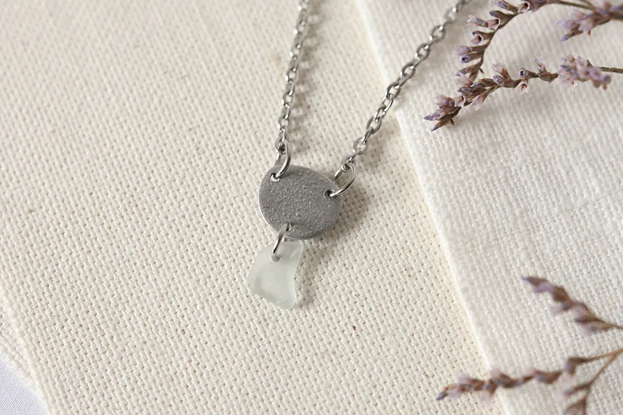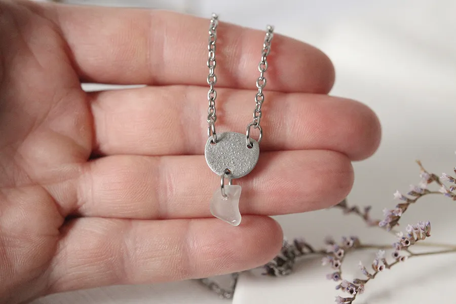 Ogrlica Crystal Wave je minimalistična a posebna ogrlica, ki združuje droben ročno izdelan obesek iz aluminija s teksturo kamna in drobno morsko steklo v prozorni beli barvi, ki ima obliko vala. Oblikovalo ga je morje, ki mu je skozi leta dalo gladko, edinstveno obliko.