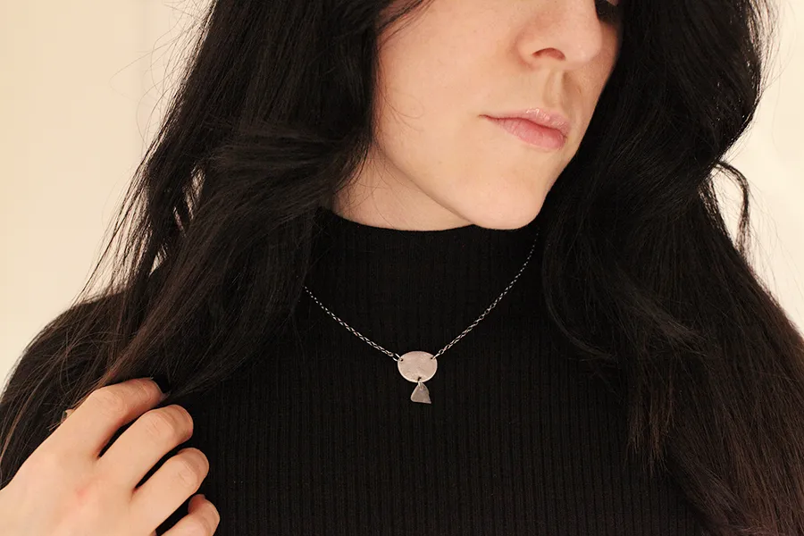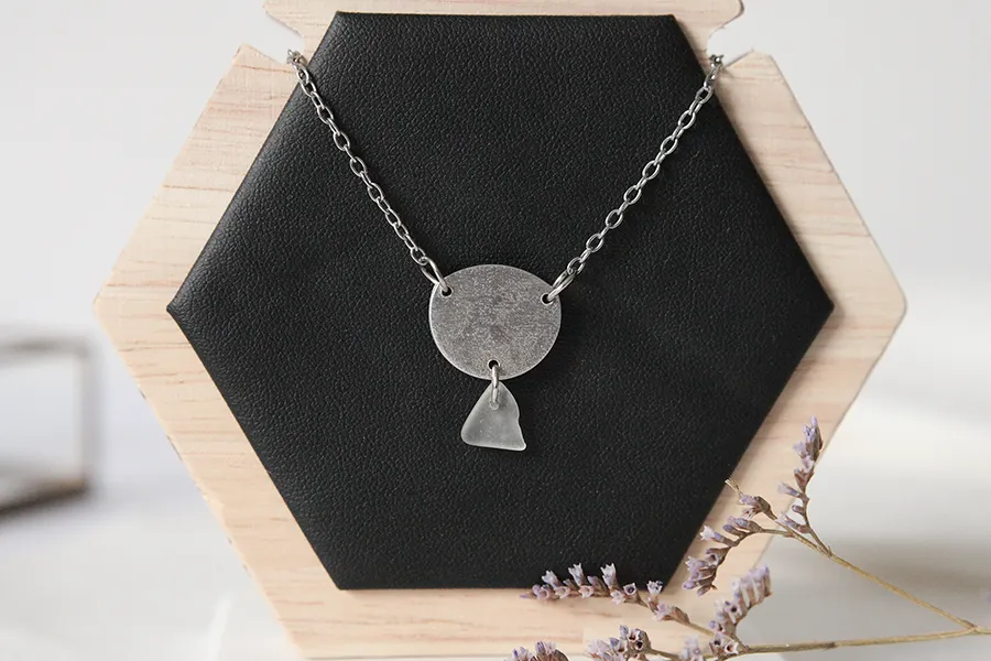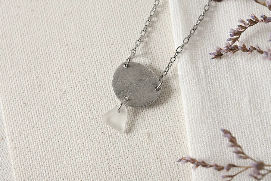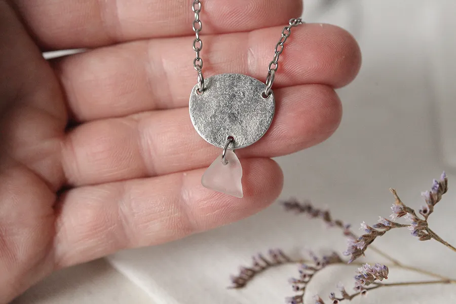 Ogrlica Echo je minimalistična a posebna ogrlica, ki združuje ročno izdelan obesek iz aluminija s teksturo kamna in drobno trikotno morsko steklo v prozorni beli barvi. Oblikovalo ga je morje, ki mu je skozi leta dalo gladko, edinstveno obliko.