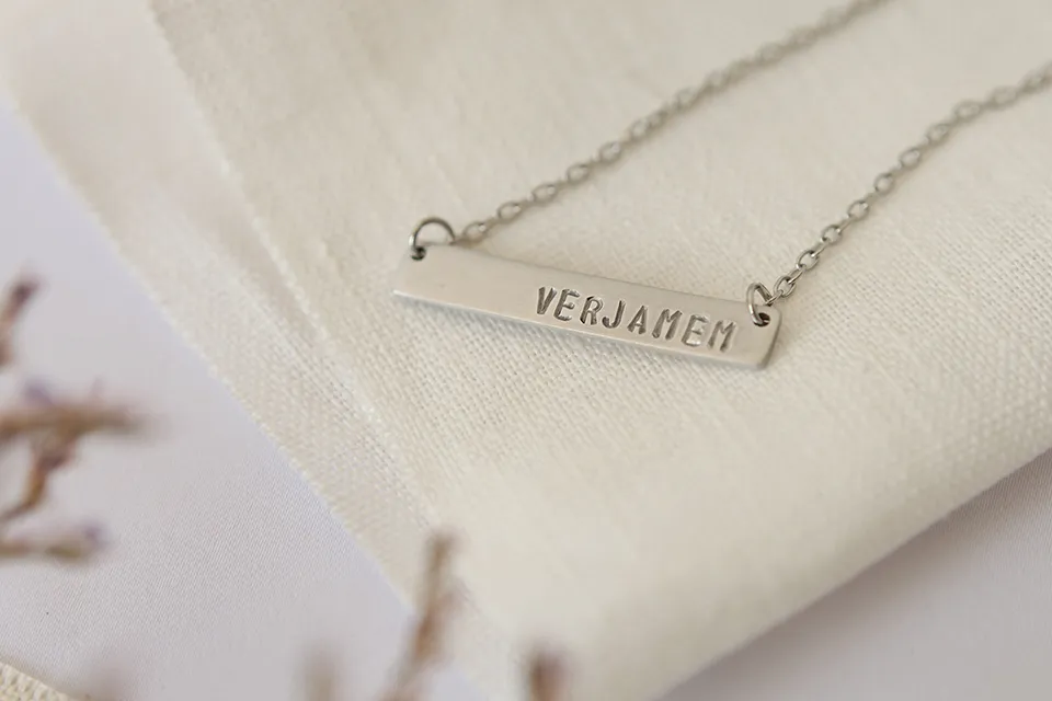 Ogrlica z napisom na ploščici je minimalistična in drobna ogrlica, ki lahko nosi nekaj zelo pomembnega.