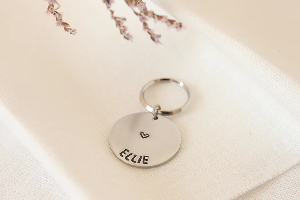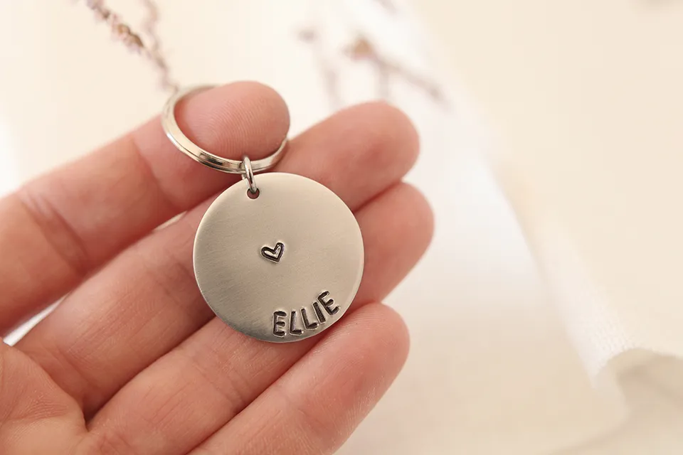 Ime tvojega psa bo vtisnjeno v obesek na način, kot je prikazano na fotografiji. Če bi želela, da je izgled tvojega obeska drugačen, me kontaktiraj in z veseljem ugodim tvojim željam.